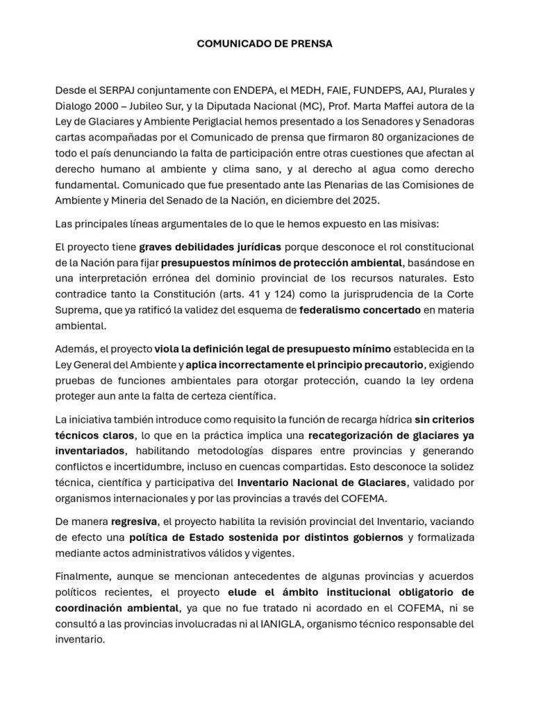 Desde el Servicio Paz y Justicia (SERPAJ), junto al Equipo Nacional de Pastoral Aborigen, el Movimiento Ecuménico por los Derechos Humanos (MEDH), la Fundación Ambiente e Recursos Naturales (FAIE), la Fundación para el Desarrollo de Políticas Sustentables (FUNDEPS), la Asociación Argentina de Juristas (AAJ), Plurales y Diálogo 2000 – Jubileo Sur, junto a la Diputada Nacional (MC) Prof. Marta Maffei, autora de la Ley de Glaciares y Ambiente Periglacial, se impulsó un nuevo pronunciamiento institucional ante el Senado de la Nación para advertir sobre riesgos jurídicos, ambientales y democráticos vinculados a un proyecto en debate.