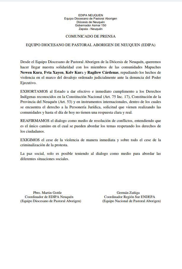 El documento, firmado por Martín Gottle, coordinador del EDiPA y Germán Zúñiga coordinador de la Región Sur de ENDEPA, repudia los hechos de violencia ocurridos en el marco de un procedimiento impulsado por el Poder Ejecutivo.Las Comunidades afectadas son Newen Kura, Fvta Xayen, Kelu Kura y Ragilew Cárdenas.