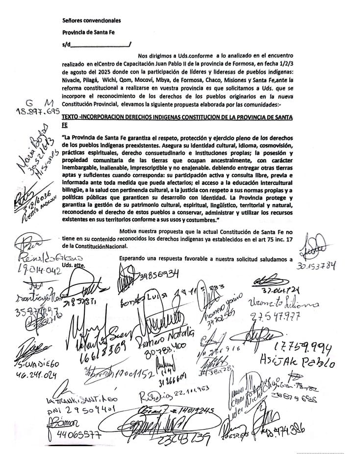 En consonancia con esta declaración, representantes de los Pueblos Indígenas presentaron proyectos específicos de reforma constitucional tanto para Santa Fe como para Formosa. En el caso santafesino, solicitaron que la nueva Carta Magna provincial reconozca los derechos indígenas conforme al artículo 75, inciso 17 de la Constitución Nacional, incluyendo la garantía de la identidad cultural, idioma, derecho consuetudinario, educación intercultural, propiedad comunitaria ancestral de carácter inembargable y consulta libre, previa e informada.