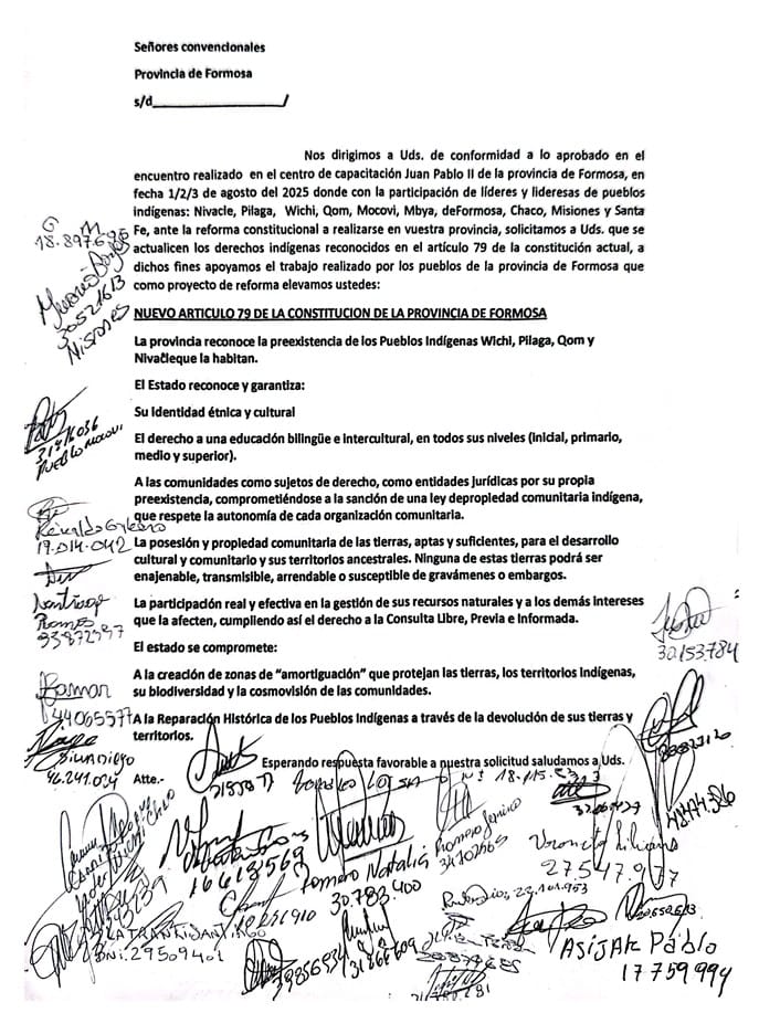 El borrador de reforma propuesto para Formosa apunta a actualizar el artículo 79 de la Constitución provincial, reconociendo la preexistencia de los pueblos Wichí, Pilagá, Qom y Nivaĉle, asegurando educación bilingüe, participación en la gestión de recursos, propiedad comunitaria intransferible, creación de zonas de amortiguamiento y reparación histórica mediante la devolución de territorios ancestrales.