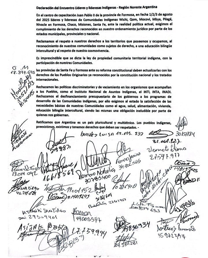 En el marco del 7° Encuentro de Líderes y Lideresas Indígenas del NEA, un espacio propiciado por el Equipo Nacional de Pastoral Aborigen (ENDEPA), realizado los días 1, 2 y 3 de agosto en el Centro de Capacitación Juan Pablo II de la provincia de Formosa, representantes de los Pueblos Wichí, Qom, Mocoví, Mbya Guaraní, Pilagá y Nivaĉle que habitan en Formosa, Chaco, Misiones y Santa Fe emitieron una declaración conjunta en la que reclaman respeto territorial, reconocimiento como sujetos de derecho y participación activa en las políticas públicas.
